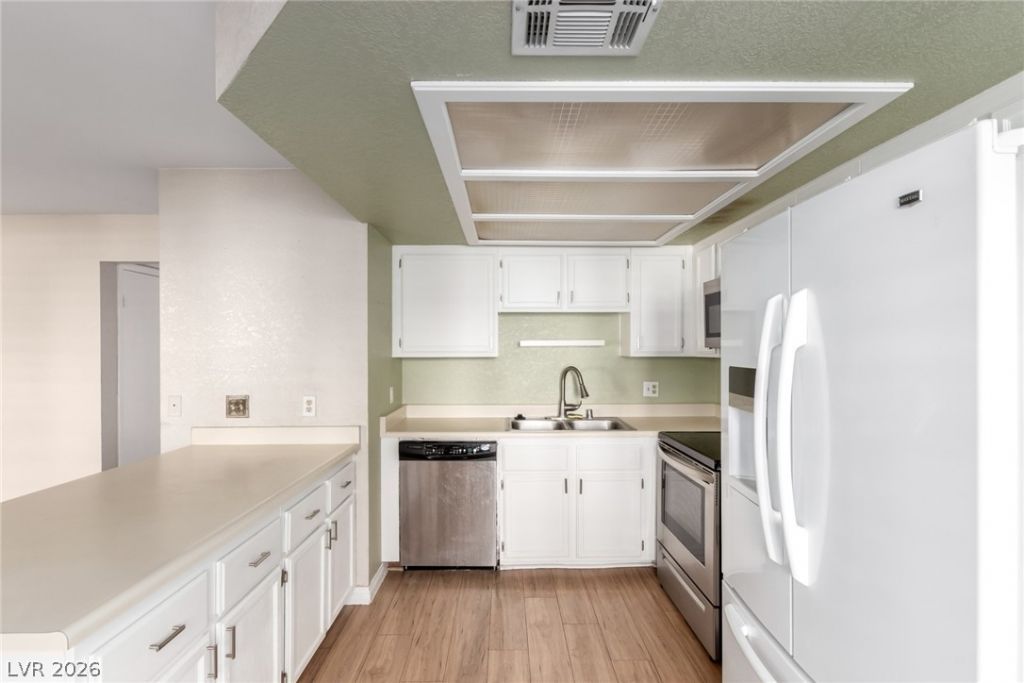 Take a look at this move-in ready 2-bedroom, 2-bathroom ground-floor condo in Rock Springs Vista, Northwest Las Vegas, minutes from Summerlin. Features woodgrain flooring, stainless steel appliances, a wood-burning fireplace, and custom shutters with security locks. The unit is fully updated with smooth ceilings (popcorn removed), refreshed kitchen and bathroom cabinets, and a freshly painted primary bedroom. A brand-new high-efficiency AC unit combined with a sun-sheltered unit orientation keeps the home naturally cooler and electric bills significantly lower than comparable units. HOA includes pools, spas, and beautifully maintained grounds. Enjoy walkable access to Summerlin's top shopping, dining, and parks, plus quick connections to US-95 and the 215 Beltway. Red Rock Canyon is minutes away. Comfort, style, and location, this one checks every box and is priced below comps.